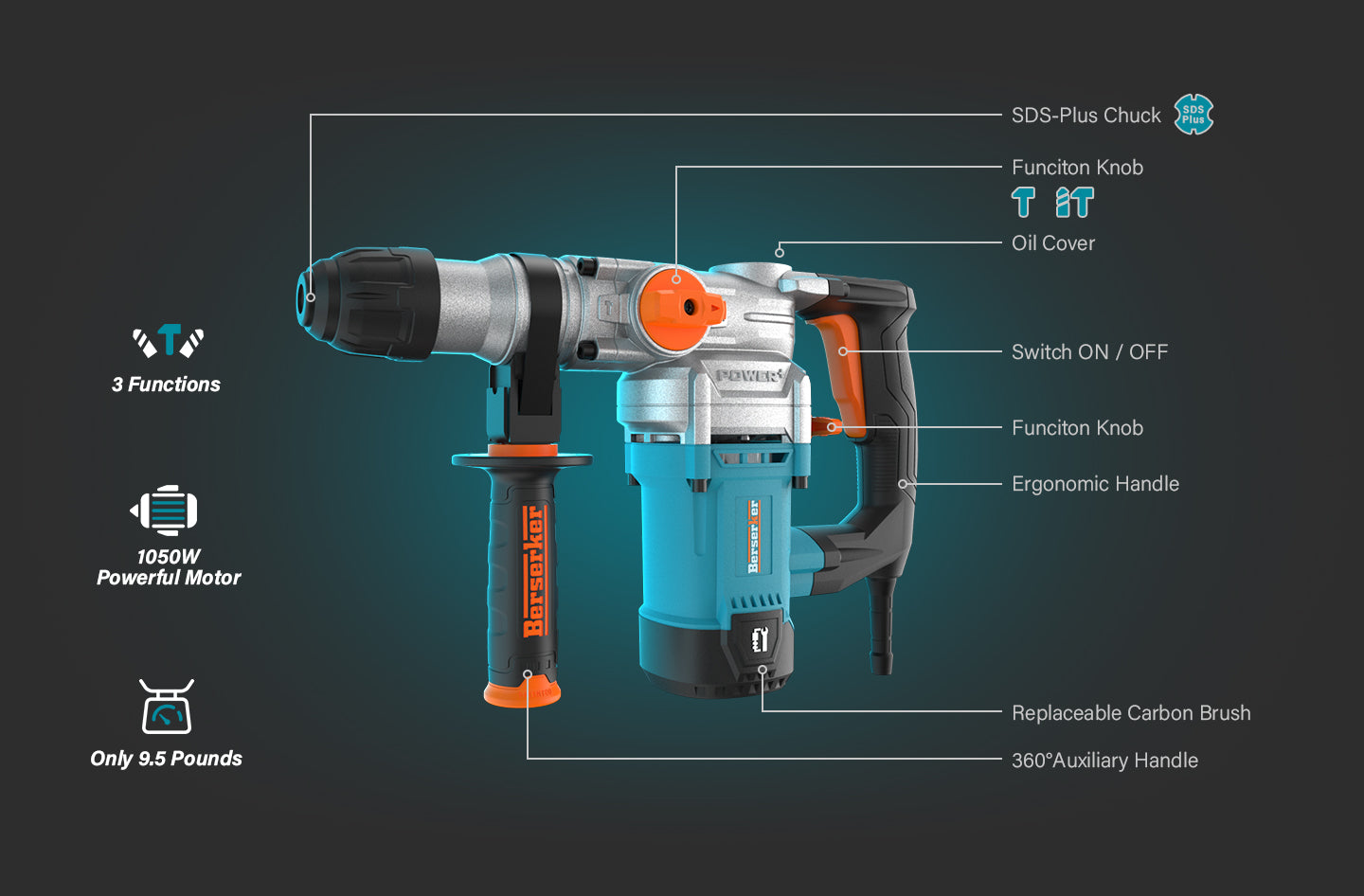 The Berserker sds plus rotary hammer delivers 4.5 joules of impact energy for fast drilling in concrete. It can quickly chisel through concrete and masonry walls, remove plaster and tile, chisel through breaks and perforations in pipes in walls and floors, and concrete repair work.