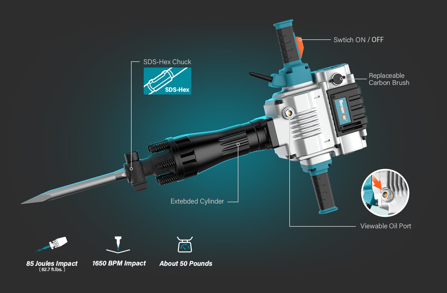 - Brute breaker tools: The heavy duty jack hammer 125K is a True "Berserker", perfect for breaking holes, trenching, chipping and demolition in concrete, block, brick, tile, stucco, housing foundation removal, concrete slab, oil chimney and much more! We provide 24 months warranty service.