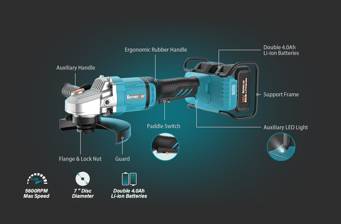 Introducing the BSK-118 cordless angle grinder by Berserker, a powerful tool tailored for an array of applications including cutting, polishing, and grinding metal, brick, tile, and wood. Equipped with a highly efficient brushless motor, this grinder promises a longer lifespan and delivers a robust 5600 RPM for diverse tasks.